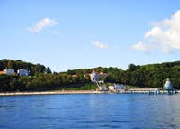 Binz is located at the Prorer Wiek. With about 6000 inhabitants, it is the largest Baltic Sea resort of the island of Ruegen. It was documented for the first time in 1318 as the fishing village Byntze. The open sea adjoins in the East close to the moorland Schmale Heide and the castle Granitz, located at the lake Schmachter See. Noteworthy are the 1872 hours of sunshine per year as well as the broad sandy beach and the spa architecture. The promenade is 3.2 km long. Its attractions are the Kurhaus, the concert hall with a pavillon, the pergolas and the pump room. Together with the sea bridge in its centre of the promenade, these sights invite guests for a stroll.